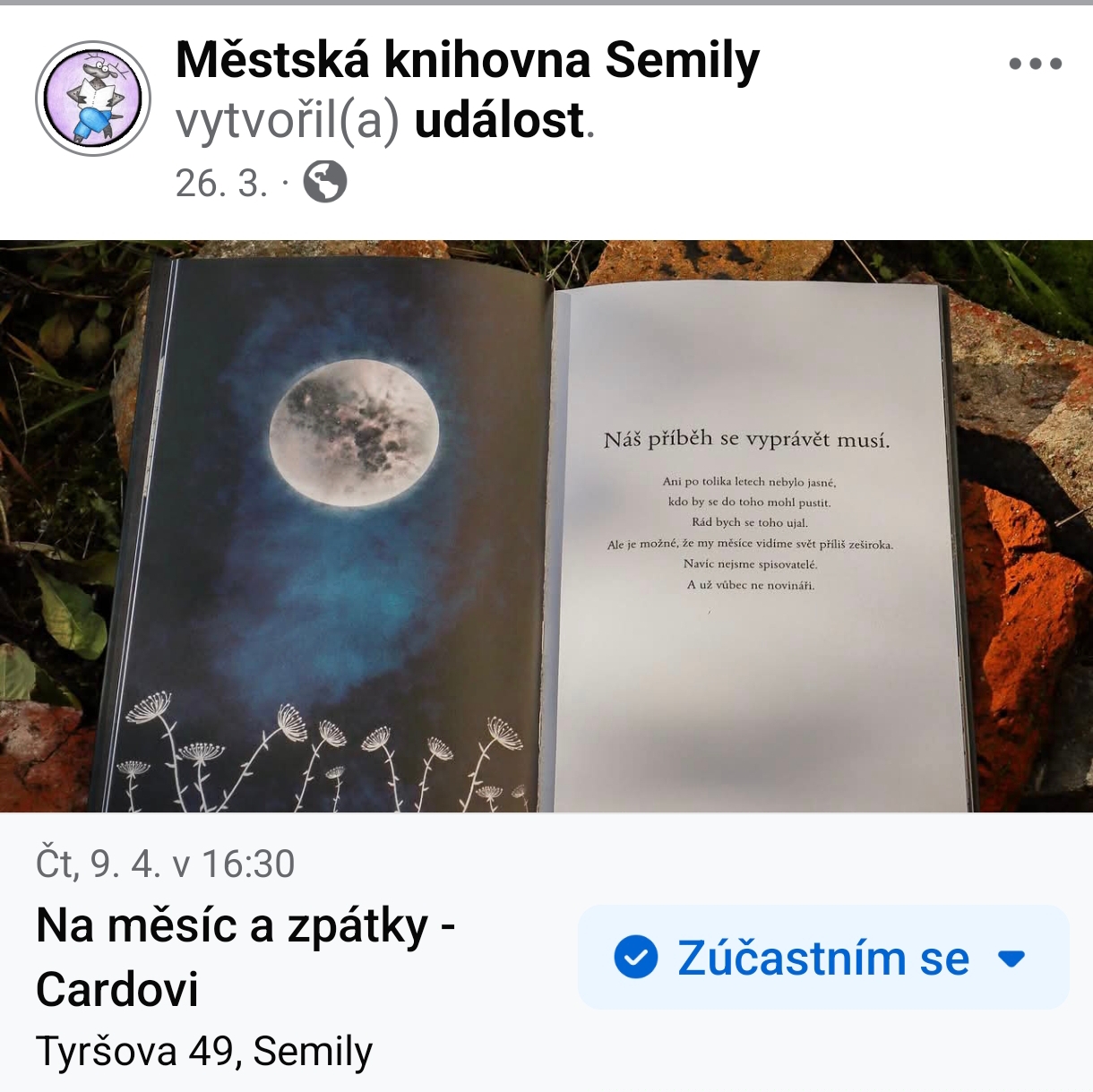 Zveme rodiče s dětmi, rodiče bez dětí, učitele i jakékoliv jiné zájemce do Městské knihovny Semily na odpoledne strávené nad naší knihou NA MĚSÍC A ZPÁTKY.